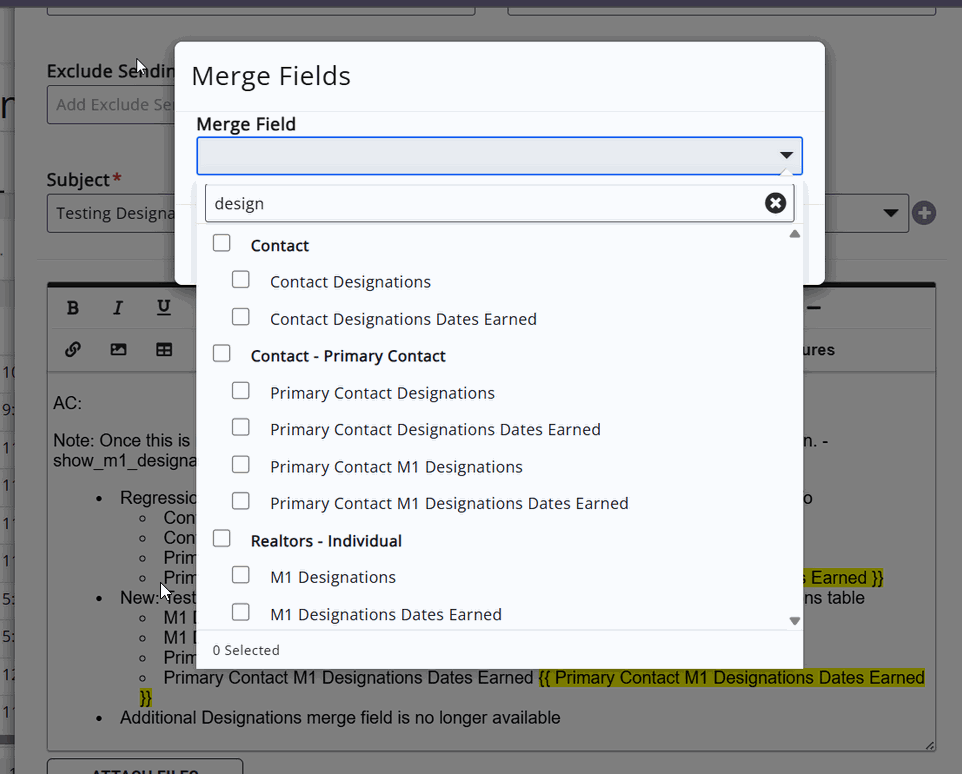 Behind the scenes, the real estate designations are now stored in a new location. This means that to pull the designation information in reports and merge fields, a new field must be used to get the M1 designations. To ease the transition to this new structure, contact designation merge/report fields and the agent's Overview tab will continue to include real estate designations until September 23, 2025.