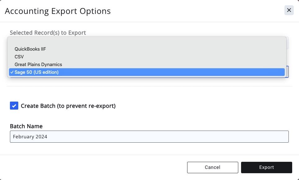 Customers who use Sage-50 now have the option of a convenient CSV export. This can be found by navigating to the Billing module > Reports > Export Accounting Transactions.