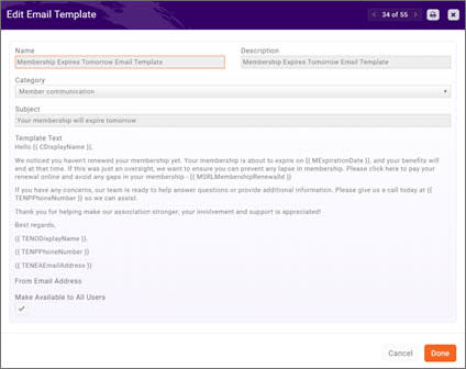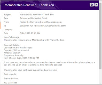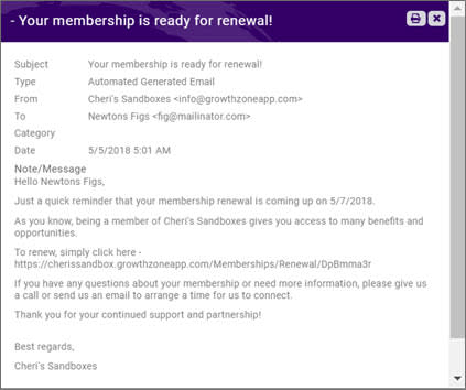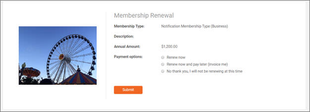 Membership Renewal Reminder Email: On the Renewal Notification Date the Membership Renewal Reminder Email will be sent. This notification is sent to Active members that will be billed an amount for their upcoming renewal. Renewal notification date is X number of days prior to the membership expiration date.