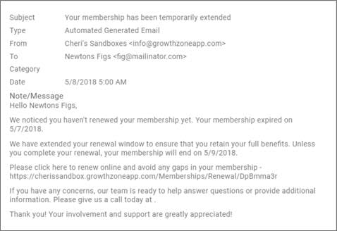 Membership Entered Grace Period email: If the Membership has Grace Period Days, the Membership Entered Grace Period email is sent the day after the Expiration Date. The email contains the expiration date, and a link to renew the membership on-line. NOTE: For membership that has the status of Courtesy, no renewal notification email is sent out.