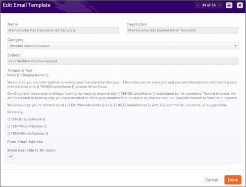 Membership Has Expired email: The day after the end of the Grace Period (or the day after Expiration if no Grace Period days are defined), the Membership Has Expired email is sent out. The email does not contain a link to renew on-line, it directs them to contact the association. NOTE: For membership that has the status of Courtesy, no renewal notification email is sent out.