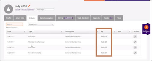 A: The Member Renewal will be displayed on the Activity tab for the organization, along with who renewed the membership. If the membership renewal was completed by someone online from the link within the email, the Contact Name will be displayed in the By column.