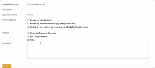 A: If the member selects "No thank you. I will not be renewing my membership at this time." a drop-down list of public drop reasons will be displayed. The member may select a drop reason and add additional comments.