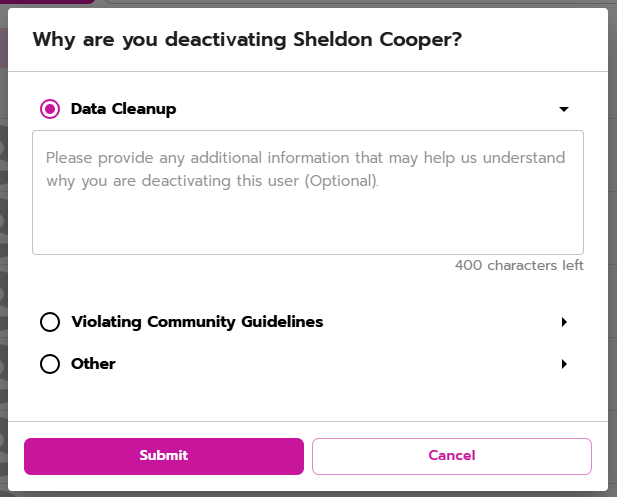 Clicking on the new icon to "Deactivate User" will present you with a list of reasons to choose from. The additional comments are optional except when "Other" is selected.