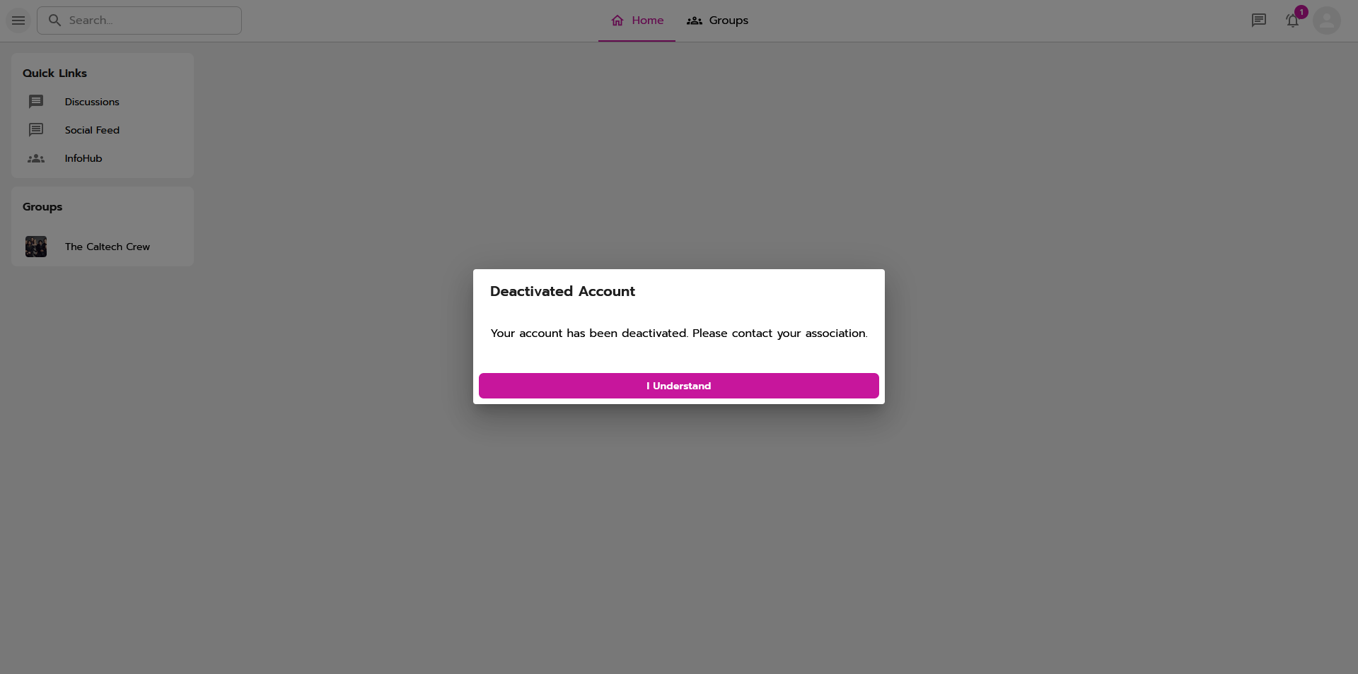 The deactivated user will receive a message on screen if they are deactivated while logged into the Community Platform. The same message will be displayed for the user if they are still able to authenticate via the member portal and attempt to log into Community.