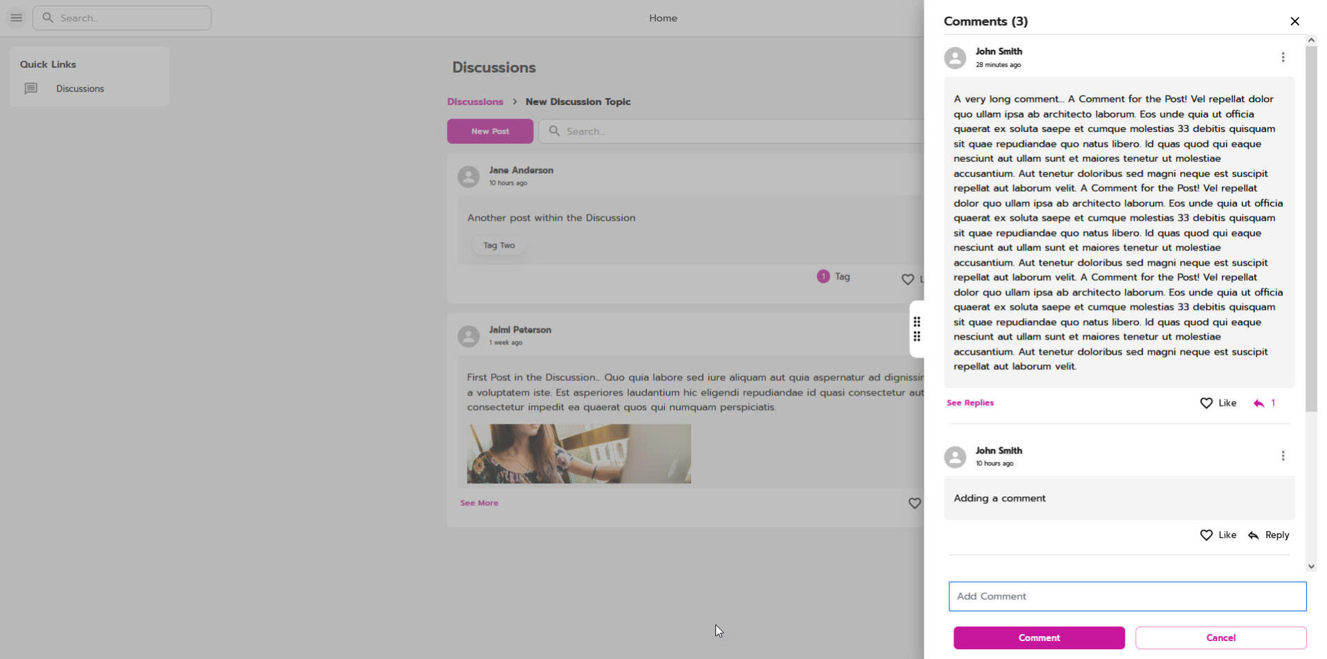 The new drawer design allows users to engage with the discussions and posts in a way where the main items remain in view, making it easier to reference post details when adding comments or replies.