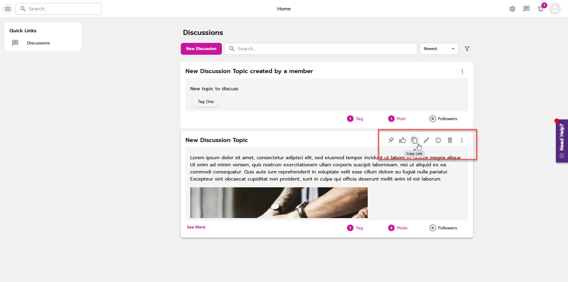 At the discussion level, the number of followers and posts within each discussion will display. Clicking on "posts" will navigate the user to view the posts that exist within the discussion.
