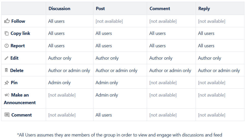The action buttons are restyled and reorganized so that at the space at the bottom of the discussions and post is reserved for engaging within them. The actions available within the ellipsis will be where the other action items will be available, such as editing, deleting, reporting, pinning, copying the link, or making an announcement (for posts only).